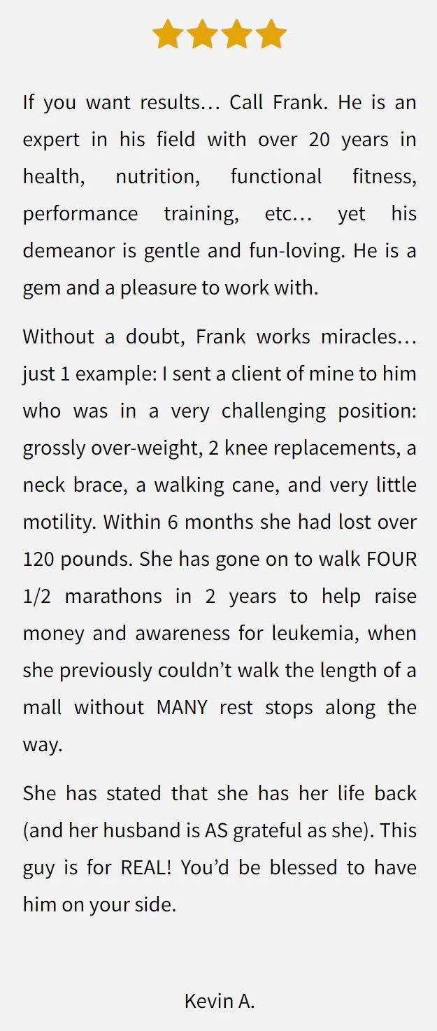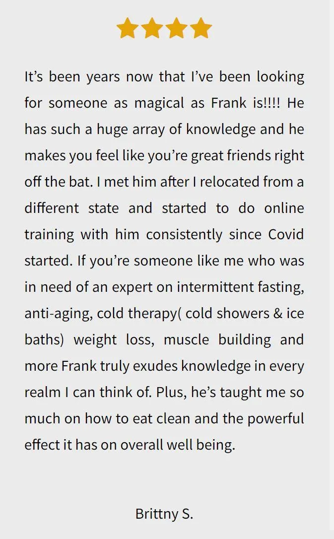 From functional workouts, intermittent fasting principles, cold therapy (cold showers / cryotherapy / ice bath), eating a real food diet while embodying the "food is medicine" concept and more, Frank believes that discipline is the core foundation for any picture of success in life.